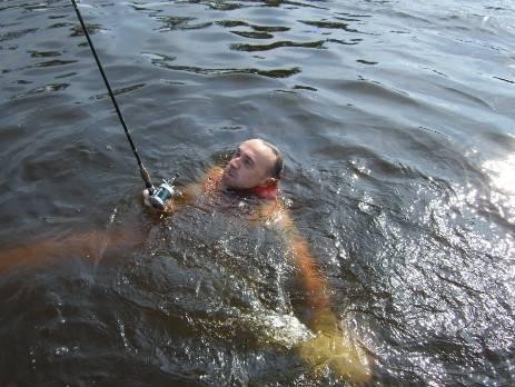 Na een paar keer te hebben gedoken kwam hij boven met de hengel. “Ik heb hem!” riep hij snakkend naar lucht. “Ik heb em ook, maar dan op de foto!”, zei ik er snel achter aan.