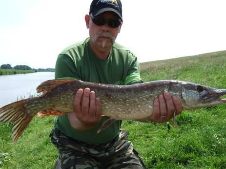 Onze voorraad aan zonnebrandcrème kwam goed van pas. Het weer, zoals voorspeld door Piet Paulusma, was erg mooi. Na een half uur te hebben rondgedobbert kreeg Hennie de eerste vis aan zijn plug. Het was een snoek van 68 cm die zijn plug diep onder water liet gaan.