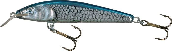 Ik had mijn nieuwe warmtepak aan wat me goed beschermde ertegen maar Patje zijn spijkerbroek bleek toch niet "waterproof".Een vuilniszak werd even gebruikt als regenbroek en we konden weer verder.We waren nog niet lang op weg toen Patrick zijn eerste aanbeet kreeg op de salmo sting.Een langwerpige plug van een centimeter of 9 met een chroom kleurige onderzijde en een felblauwe bovenkant.Patje heeft op deze plug al heel wat snoeken en baarsen weten te vangen,en ook deze had hem helemaal op willen vreten zoals te zien is op de foto.Het was een snoek van zo'n 65 cm,werd onthaakt en terug in zijn koude water teruggezet( watertemperatuur was plaatselijk 3.6 graden)