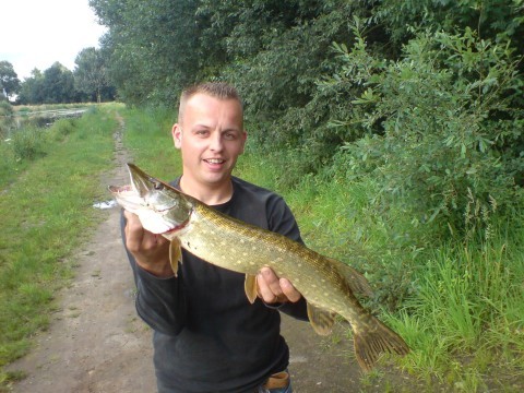 Woensdag avond zijn we met zijn drieën weesten vissen op de dommel.Nadat Patje al vlug een baars wist te haken kreeg Eric beet op zijn Salmo frisky plugje.Mar helaas (voor eric ) loste deze vis zichzelf en klapte op mijn mepps streamer.Na een korte dril door een plantenbed konden we de snoek van zo'n 65 cm landen.Daarna ving Patje nog 3 baarzen en Eric 1.Ik wist ook nog een baarsje te haken en toen we terugliepen naar de auto ving ik nog een snoek van 70 cm op 1,5 meter uit de kant!!Mijn vakantie kon niet beter beginnen.Ik ga binnenkort nog een keer met Patje naar de Linge,maar dat horen jullie wel weer.......