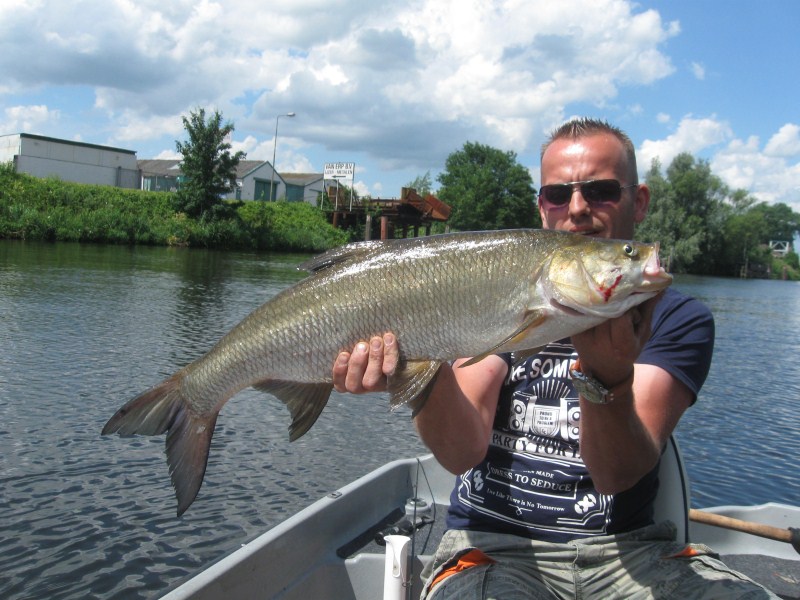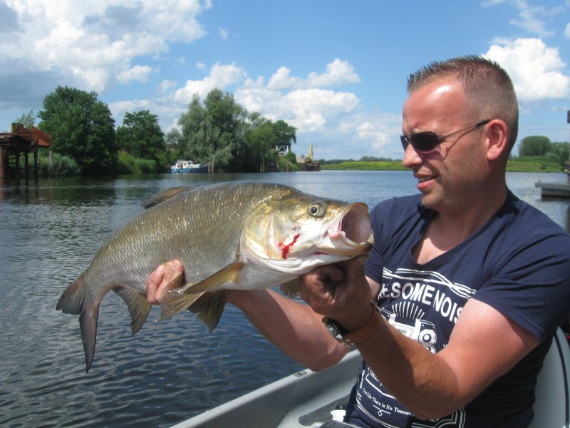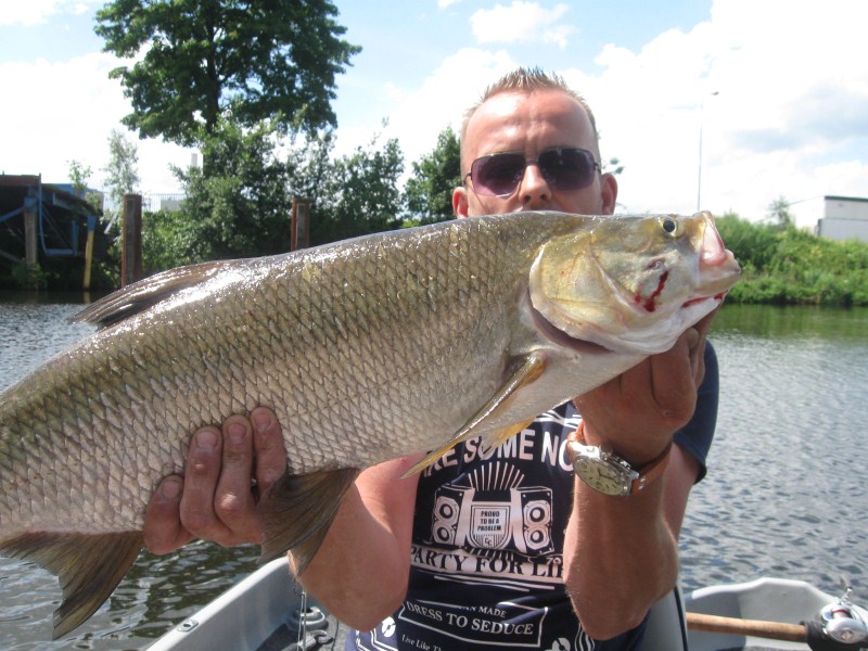 Na nog wat baarzen gehaakt te hebben besluit ik toch een andere kant op te gaan.In een buitenbocht zien we een dikke snoek een aanval doen op een eendje! Wat een geweld op 30 cm water.Jerk- en spinnerbaits worden als speren op de bewuste plek geworpen maar het haalt niets uit.Verder dan maar,een zijtak van een vaart in.Net voor een viaduct stuur ik de boot langs wat dikke houten palen af,ondertussen vissende met een Triple en Baby devil.Rob zegt tegen me "Hier komt een dikke vis voor jou." En jawel hoor,met een enorm geweld wordt mijn steunhengel rond getrokken.Echt rond! Als een dolle gaat er een vis door het water en ik ben alleen maar bezig de voor mijn nog onbekende tegenstander tussen de palen uit te houden.Eénmaal aan het oppervlak schrik ik,een enorme roofblei heeft de triple devil tussen de kaken genomen.Wat een vis!! Voor de zekerheid laat ik hem in het rubber-net glijden en ga op de foto.Meetlint erlangs en bij 81 cm is het op! Mijn PR verbeterd met 26 cm. Wat een ervaring is dit.