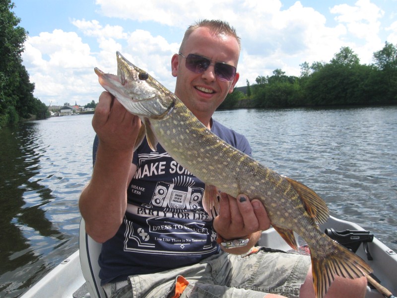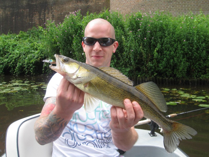 Na een aantal testen op een kanaal hier in de buurt,kon vandaag mijn Basstender 10.2 mee naar wat groter water.Eigenlijk zouden we zondag gaan maar vanwege de slechte vooruitzichten toch maar een dag vrij genomen.Er MOEST gevist worden.Omdat mijn maat voor vandaag, vrijdagavond een feest had en even zijn kater wilde laten rusten, lagen we om 10.00 uur op het water.Motor effe warmdraaien en trollen maar.Na een 100 meter tikt er al een leuke baars op de Spro chibi shad van Rob.Een leuk interessant plugje blijft het,die de baars en snoekbaars maar wat graag te grazen nemen.De baars gaat weer overboord,evenals onze pluggen.Een honderd meter voor een viaduct zeg ik nog: Hier zou wel is een mooie rover kunnen liggen....Ik heb het nog niet gezegd of Rob zijn hengel slaat in een mooie ronding in de steun.Pakken en drillen maar,een mooie snoek is het resultaat Tien minuten onderweg en al twee rovers in de boot.Het is de eerste snoek die mijn bootje van binnen te zien krijgt.Maar niet de laatste...