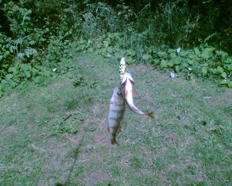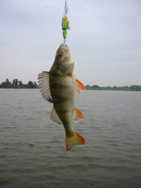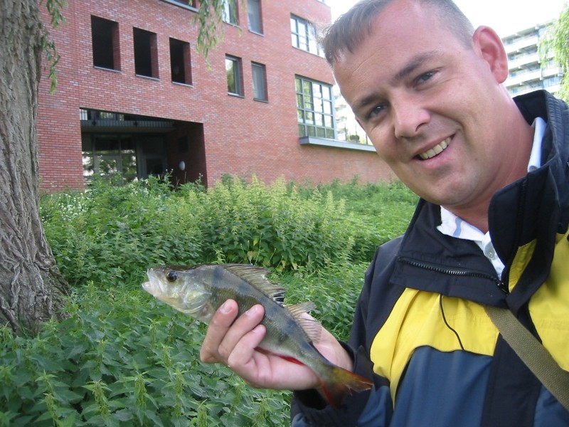 Zo ben ik binnen een uur rijden van mijn huis uit op zoek gegaan naar mooie stekken of veel belovende watertjes. Niet alle stekken bleken zo succesvol te zijn als in eerste instantie gedacht... Zo heb ik bijvoorbeeld na een langere periode stabiel weer te hebben een watertje in de polder opgezocht en er al het kunstaas dat werken moet in het water rond laten dartelen en vervolgens nog een keer. Maar niets, helemaal niets wist ik te interesseren. Met een ietwat teleurgesteld gevoel ben ik weer op huis aan gegaan om de volgende keer eens een ander watertje uit te gaan zoeken. Zo ben ik met mijn oudste dochter, Daniëlla, naar de rijnhaven in Wageningen gegaan. De schipper van een rijnaak daar vertelde dat een bijzonder grote rover al enige tijd de haven onveilig maakte, enorme boeggolven en tuimelingen maakte en regelmatig zich in gehele lengte boven water liet zien. Daniëlla en ik hebben vervolgens de hele kade afgelopen en overal shads en pluggen te water gelaten... Niets. Totdat we een eind verderop bij de ingang van de haven kort op de kant een hengeltje uitgooien. Daniëlla gooit haar plugje een meter of 10 uit de kant en zo'n 15 meter verderop en begint op haar gemakje de beugel dicht te doen en te draaien als ze met een schreeuw van vreugde meld dat er een vis met een enorme dreun op haar kunstaas is geklapt. De sprongen en het driftige gespartel van de vis duiden op een baarsje. De vis die ze uiteindelijk weet te landen is inderdaad een baarsje... VAN RUIM 25CM... Wordt je dan niet gek? Met al je techniek, dure kunstaas en kennis haak je niets en die kleine meid in al haar spontaniteit gooit voor haar doen de verste worp en vangt een dijk van een baars. Ik moet toegeven dat ik er later wel baars gevangen heb maar die dagen in de zomer zal ik niet gauw vergeten.