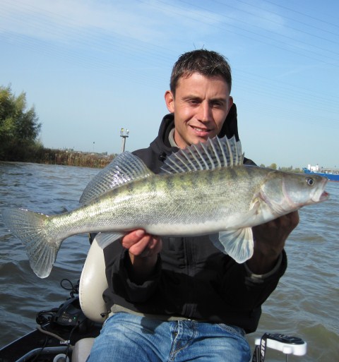 "Jeroen aan de telefoon gisteren: heb je zin om morgen een paar uur te vissen? Zin heb ik altijd, maar tijd is meestal het probleem... Deze keer had ik echter geluk, want de hele voormiddag tot een stuk in de namiddag was vergaderingloos! Rond een uur of tien lieten we de boot in de rivier glijden. Twee Duitse concullega's die de "vroege-ochtendshift" gevist hadden, gaven er op datzelfde moment al de brui aan: "Viel zu troebel" of zoiets mompelden ze, "und die Stromung, oei oei oei"... We trokken er ons niets van aan: hun bootje leek ons zelfs voor een vijver nogal aan de lichte kant, laat staan voor een van de machtige Nederlandse rivieren... Het stroomde hard, maar het was wel te doen om te vissen - dus daar kregen wij gelijk met onze eigenzinnigheid. Het water was echter inderdaad bizar troebel - en helaas moesten we na een uurtje of drie vissen vaststellen dat de snoekbaarzen daar niet bepaald op gesteld waren... Vreemd, want met hun reputatie van vieswaterliefhebbers had ik het anders verwacht. Of lag het aan de weersomstandigheden? Ook dat is mogelijk: een stralend zonnetje toverde 23 graden op de thermometer en dat half oktober! Goed, we kregen wel een beetje actie, met name op schoepstaartshads met een heel uitbundige actie (die vallen meer op, weet u wel), maar het eindresultaat was toch niet om naar huis te schrijven, want de meeste aanbeten verspeelden we, en de paar vissen die we wél vingen, waren op één na nogal aan de kleine kant. Maar ja, het is en blijft vissen he - en taaie dagen moeten er ook zijn, want daardoor waardeer je de goeie dagen des te meer! Succes allemaal!" greetz