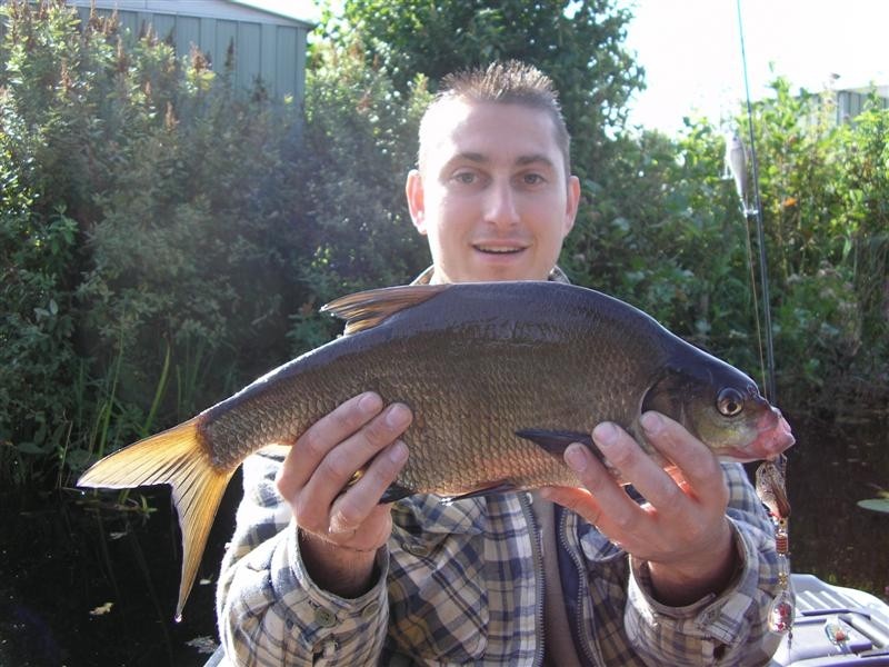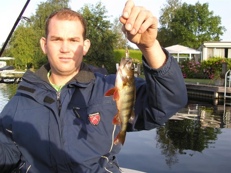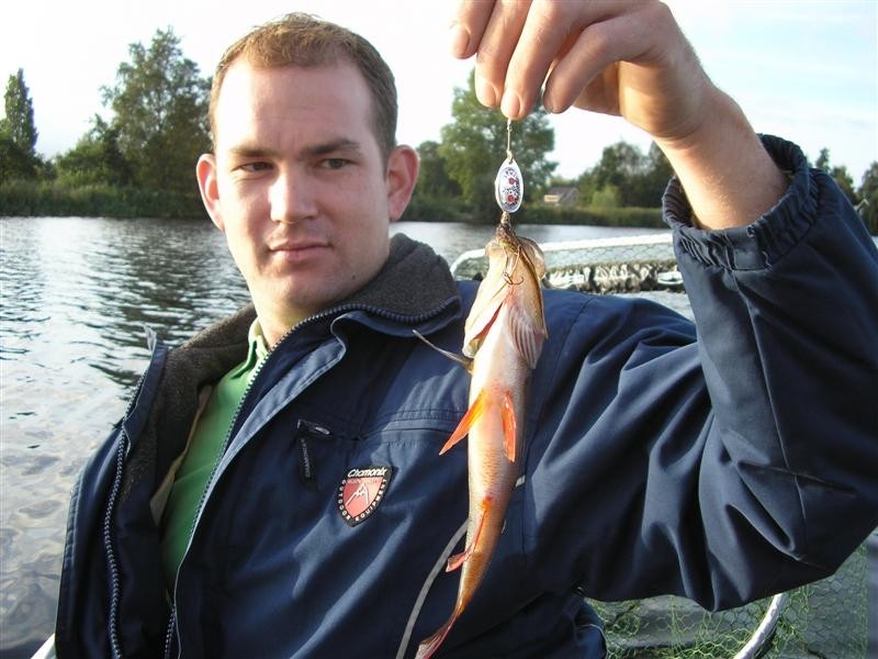 Naarmate het water dieper werd bleven de aanbeten uit in het ondiepere (1.5 tot 3m) camping gedeelte volgde de aanbeten elkaar snel op maar bij de diepere stukken op het meer (3 tot 4.5m) wilde het niet lukken. Rond 12.00u Trolde we voorbij een man die vroeg of we al wat hadden gevangen. Op dat moment stond de teller op12 Baarzen en een Snoek. We vertelde dat we op de ondiepe stukken bijna alles hadden gevangen en op de diepe stukken bijna niets. De man bleek zelf ook een fanatieke Roofvisser te zijn en zij dat we beter naar de Nieuwkoopse Plassen hadden kunnen gaan. De VinkeVeense Plassen zijn veel te helder en te toeristisch zij hij. Met dat advies zijn we recht naat de auto terug getrold, waarbij we nog wat Baarzen vingen en ik een Snoekje van45cm. Ook ving ik op de Mepps Aglia Spinner een dikke roofzuchtige Brasem van zeker 50 cm. Deze kon de verlieding van het kunstaas blijkbaar niet weerstaan want de Streamer zat door de Brasem zijn lip wat betekend dat hij echt heeft toegehapt. Het is nu de tweede maal dat Patrick en ik dit mee maken dit jaar. Op de BiesBos wist Patrick ook al een roof Brasem in het lipje te haken op een Salmo Hornet (zie verslag roofvissen op de BiesBos). Worden de nederlandse Brasems agressiever ?? Hij gaf in ieder geval goede sport op mijn spinshengel.