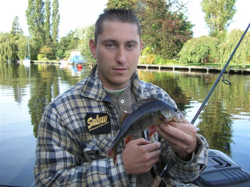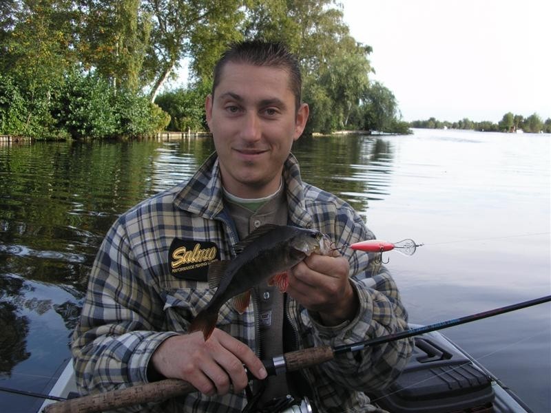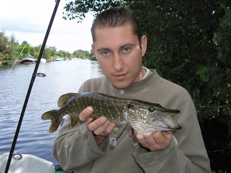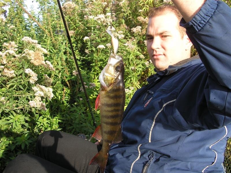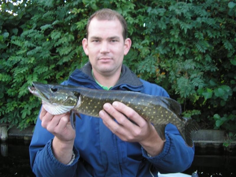 We begonnen te Trollen tussen een soort van camping door waar Patrick al meteen een baarsje wist te verschalken. Een paar meter verder weer en kort daarop weer. Patrick viste met de zilver kleur streamer ik met de goude dus ruilde ik mijn goude om voor zilver en het was meteen raak. Nadat we verschillende Baarzen hadden gevangen diende bij Patrick de eerste zich Snoek aan. De Snoek had een agressieve aanbeet en leek in het begin groter dan hij was. Na een korte felle dril kon Patrick de Snoek van 55cm bij de kieuwen grijpen. Even meten, foto en terug.