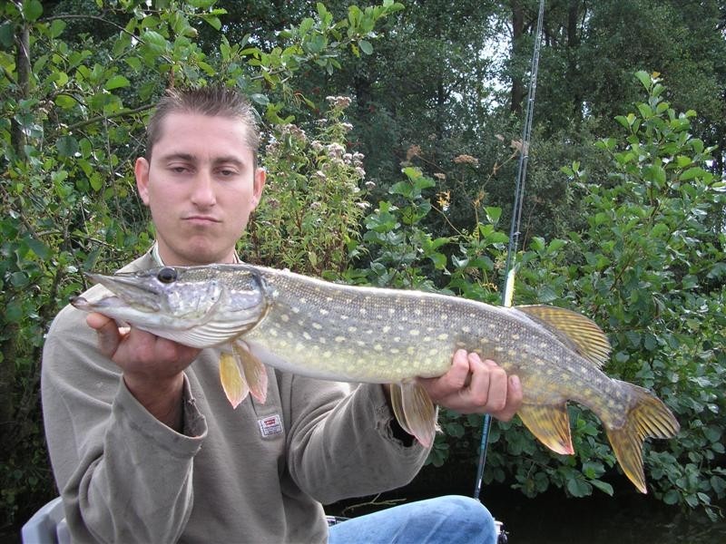 We Trolde verder door de kreekjes maar zonder resultaat. Op een stuk waar de smalle kreekjes overgingen een bredere vaart wisselde ik naar groter kunstaas. Verderop zagen we een Snoek jagen toen we een aantal meters voorbij die plek waren klapte er een Snoek op mijn hengel. Eindelijk weer eens beet. Het was een mooie Snoek van ongv. 85cm. Hij vocht erg wild het leverde en geweldige strijd waarbij hij uiteraard netjes in het net belande.