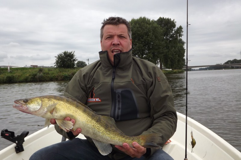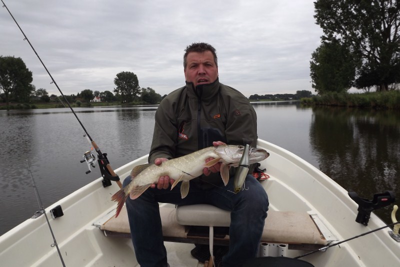 Vrijdag morgen 4.30 uur de wekker gaat…. Opstaan! Weer is goed, dus vissen!Mijn maat staat voor de deur, we hangen de boot achter de auto en vertrekken richting de Maas.Aangekomen op de plek waar ik het liefst de Maas in ga, kon ik niet met de trailer aan het water komen het staat te hoog.We besluiten door te rijden naar Cuijk om zo via de Kraaijenbergseplassen naar de Maas te varen. Aangekomen bij het plaatsje Linde/Katwijk blijkt dit gebied afgezet te zijn voor de wandel 4 daagse en er mocht geen auto in of uit. Maar goed, na een tijdje rond gereden te hebben in dit gebied is het toch nog gelukt om de trailerhelling te bereiken.Ondertussen is het 6.30 uur en kunnen we beginnen met het optuigen van de hengels, we hadden daags van te voren uitgemaakt dat we zouden gaan verticalen(voor de eerste keer), dus zo gezegd zo gedaan, de shadjes werden aan de hengels gemaakt.De weg van de haven naar de Maas is lang dus had ook had ik twee hengels opgebouwd om trollend naar de Maas te varen. Dit leverde geen vis op maar wel heel veel plantjes die in de weg stonden. Na een goed half uurtje waren we aangekomen op de plek waar we wilde gaan verticalen, goed opgelet/onthouden wat me verteld is en aan de slag, we hebben echt ons beste gedaan maar we kregen met geen mogelijkheid de shadjes fatsoenlijk op de bodem, we hebben het nog een tijdje geprobeerd ook met zwaardere jigheads maar het lukte niet. We varen verder naar de kribben in de Cuijkse Maas om hier lekker uit de stroming te kunnen vissen. Al trollende naar deze kribben vangen we nog wat baars. Tussen deze kribben lukt het ons ook niet om het aas op de bodem te krijgen zoveel stroming staat er, hierdoor besluiten we om nog maar een uurtje te gaan trollen. Dit bleek een goede keus struinend langs de plekken waar we regelmatig succes op snoek hebben gehad, lukte het ons om een snoek van 71 cm te vangen