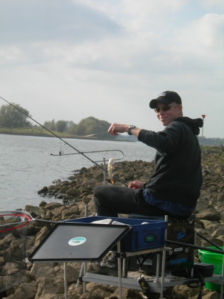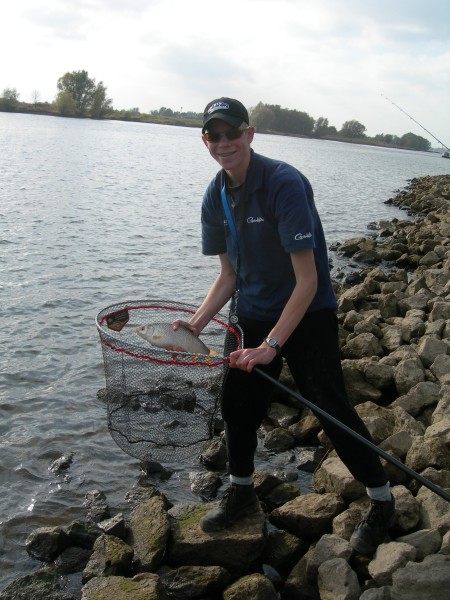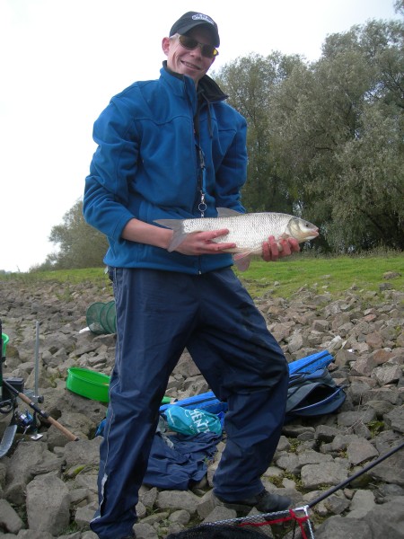 Na het optuigen begint het uitpeilen... Nog geen 50cm water op 11 meter uit de kant. Tegen beter weten in proberen we het voor een uurtje maar een vaag beetje op de feeder van Eduard is alles waarna we stroomafwaarts van de warwater uitlaat langs de Rijn gaan zitten. Hier gaat het beter. We zitten nog niet koud 5 minuten na met de feeder korfen een voerstek te hebben opgezet in de stroomnaad als mijn hengel hevig bonkt. Ik sla aan, voel heel kort weerstand waarna ik een kale haak binnen draai. Vrijwel direct daarna is Eduard aan de beurt, hij zit stroomafwaarts van me en volgens mij is het dezelfde vis die ik gemist heb grijns ik nog als Eduard een mooi vechtende Winde in het net landen kan.