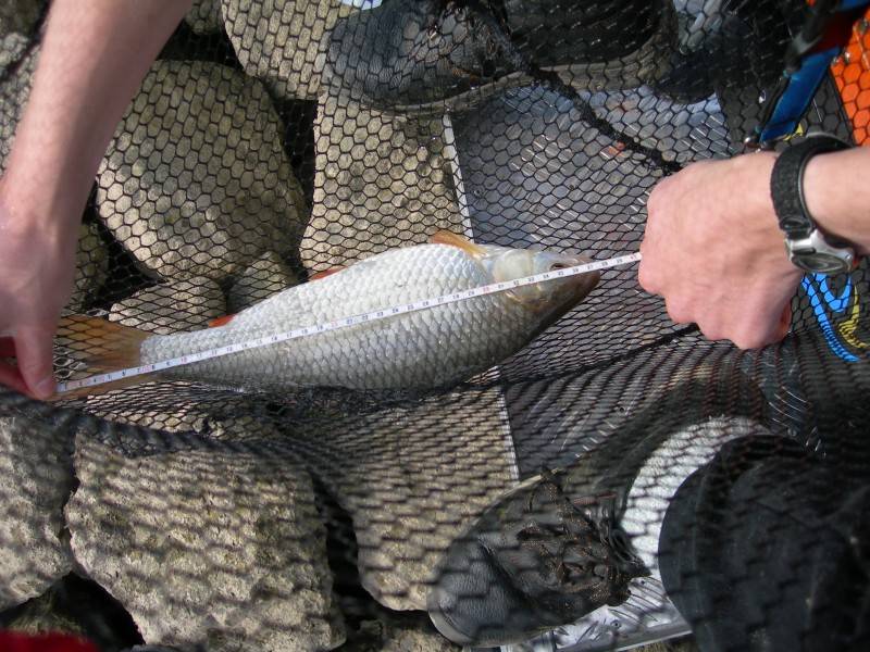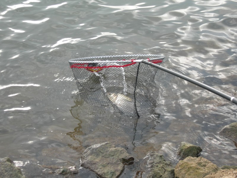 Een mooi gevecht ontspint zich en de vis geeft zich niet snel gewonnen. De dril duurt al enige minuten en telkens als Eduard het net denkt te kunnen gebruiken zwemt de Winde, want we hebben hem al gezien, weer weg. Als uiteindelijk de Winde in het net glijdt is het nog niet gedaan. Na enkele seconden is de Winde het net al weer uit en een meter de Rijn op gezwommen. Maar dat is slechts uitstel van executie want even later komt het net het water uit en is de vis geland.