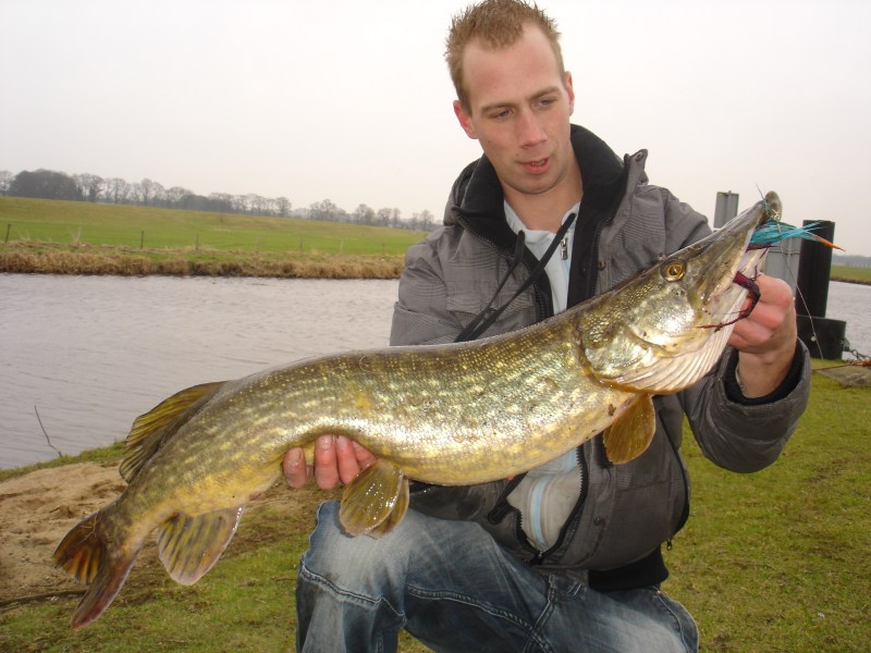 Ik zette vol trots op FACEBOOK “hier gaat het morgen mee gebeuren” met de foto van de streamer erbij.Dus vandaag moest ik er aan geloven, er zat voor mij maar één ding op en dat was snoek vangen en hoe groot maakte me niet uit als het maar snoek was!Uiteindelijk dikke 4 uur aan het struinen in de wind met een kracht van nummertje 5 en ijskoude wind ook nog.En dat maakte het vissen er niet plezieriger op. Struinen en nog is struinen, hier en daar kijken, de auto in, auto uit ,uiteindelijk weer helemaal niets!En de moed zakte me dan al weer aardig in de schoenen, vervolgens naar een plek gereden waar ik zeker nooit heen zal gaan in deze tijd, een stuw!Paar worpen gemaakt in stukken waar geen stroming stond natuurlijk en weer niks! Ik riep nog tegen mijn vismaat die op dat moment bij me was ik ga alleen nog even bij die sluis kijken en als dat niks is zet ik alles op marktplaats!Ik ging op een loopplank staan voor aanmerende boten en de eerste worp die ik maak tik, tik, tik stukje binnen draaien weer is een paar keer tikken tussen door en ik zie die fel gekleurde streamer nog aardig goed in het donkere water en WHAM!!! een klap op de hengel en ik zag hem aankomen in mijn ooghoeken en hij liet mijn hart een behoorlijk stukje sneller doen kloppen, een voltreffer en ik stond te trillen op mijn benen van de adrenaline!! Vervolgens die snoek schud een keer en weg was ie! Ik heb zo’n beetje de hele vlees afdeling van de slager het water over gevloekt nou dat was het ergste wat kon gebeuren op dat moment!Die had de haken wel gevoeld en zou hem niet weer pakken vandaag was ik bang voor, nou de “moed” weer verzamelt en verder... Een aantal worpen later klapte die er op en weer net zo hard, maar nu echt vol erover heen deze ging me niet meer los. En dat deed ie ook niet het resultaat: een snoek 86 cm met een mooi stevig buikje. Heerlijk!