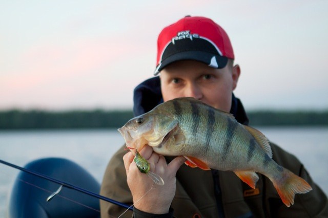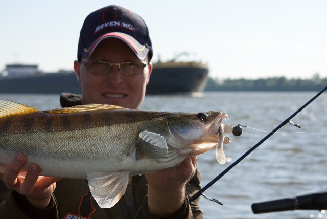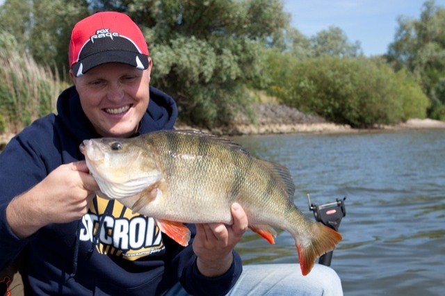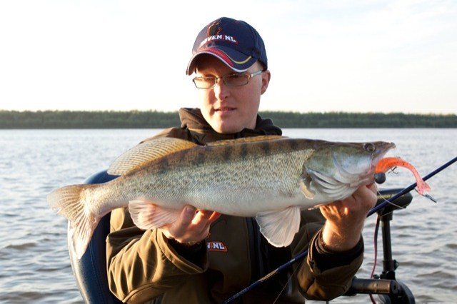Na een klein uurtje geslapen te hebben ging de wekken weer om 2 uur s'nachts. Om rond 3 uur was ik bij Freek, snel auto inladen en de lange rit kon weer beginnen. Aangekomen op de helling en de boot opgetuigd te hebben was het nog erg donker, langzaam aan starten we de motor en gingen richting de rivier.De laatste keer dat wij hier waren heb ik veel windes in het oppervlakte gezien dus was de keus niet moeilijk om wat klein trol aas mee te nemen.Freek deed er een Boxertje aan en ik begon met de Little John. De Little John die me 2 jaar geleden nog een 104cm snoek op leverde, nu hoopte ik dus op een winde.Na een paar honderd meter te hebben getrold was het voor Freek raak en haakte een mooie baars.