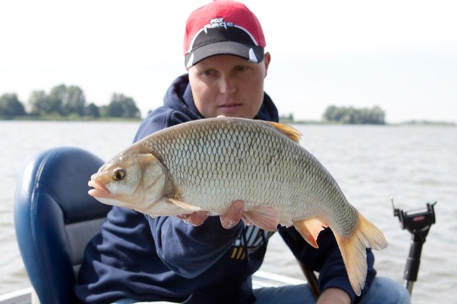 Freek die al van veel rubber had gewisseld kreeg maar geen beet.Het maakte niet uit wat hij eraan knoopte ze wilde gewoon niks hebben.Freek had een paar weken geleden een nieuwe vertikaal hengel gekocht met reel. Dit wilde ik graag eens uitproberen. Ik had nog geen ervaring met vertikalen met een reel. Het is even wennen maar toch kun je hier ook een aparte techniek mee uit je pols halen.Ik was nog geen 5 min aan het vertikalen en hoppa!! Ik kreeg op Freek zijn setje ook vis hahaha. Denk toch dat het dan te maken heeft met de techniek waarmee je je aas presenteert, ook eens leuk als je je eigen broer ziet weg zakken in zijn stoel hahaha.Het was middag en we besloten te gaan trollen, Freek weer zijn Boxertje eraan en ik koos voor een klein Salmo hornetje.We waren nog een 15 meter aan het trollen en Freek krijgt me toch een klap pff zeg deze gaf goed gas, eenmaal aan de boot zagen we een kasteel van een baars. Blijkbaar Freek zijn nieuw PR, een werkelijk schitterende 48.5 cm baars