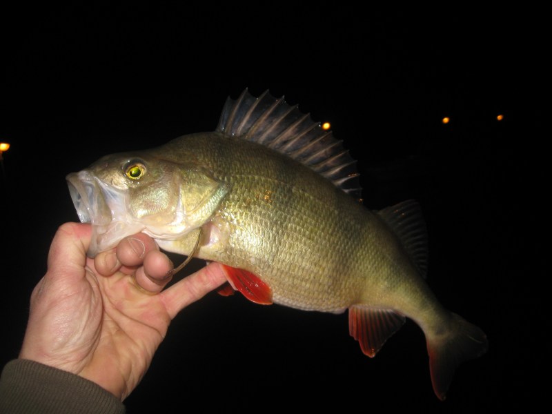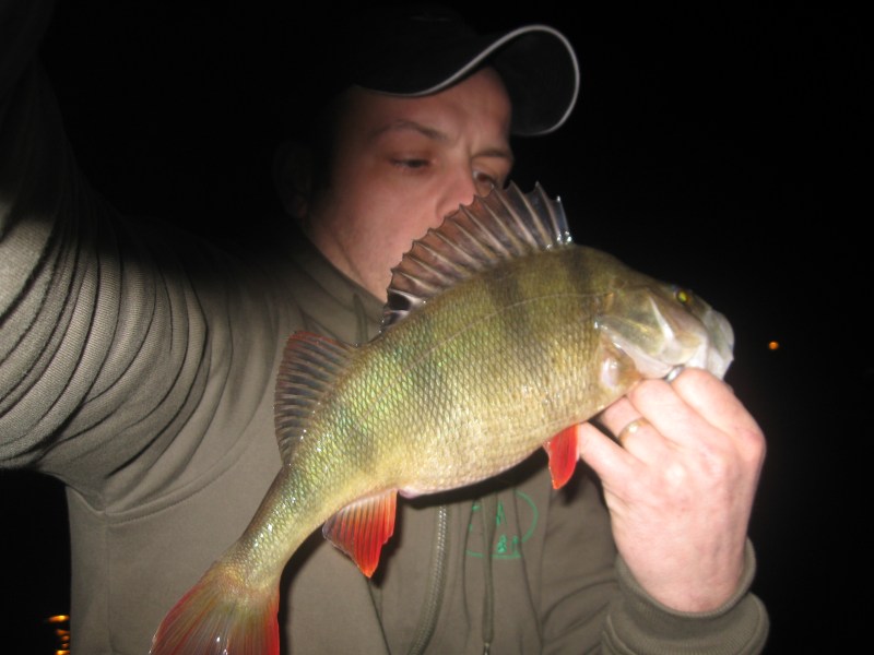 Mijn nieuwe spinhengel was de laatste week al flink getest.Ook hadden er al een paar snoeken aangehangen,allemaal leuk, maar ik blijf toch het subtiel tikken op baars het mooist vinden.De ene gaat jagen op metersnoeken met lompe zware materialen,ik ga liever "licht bepakt" vissen.Met een 10-32 grams hengeltje,voorzien van een baitcaster reeltje met 10/00 gevlochten lijn en groen Finn-s shadje op een 14 grams loodkop, ga ik vanavond weer op pad.Eerst met Robin aan het kanaal maar hij moet na een goed uurtje werpen gaan repeteren met zijn band.Ik besluit de haven op te zoeken,my favourite place.Boten,steigertjes,damwanden enz. uitkammen op zoek naar die ene ram op de top.Na een 10 minuten werpen en tikken,zwier ik de shad richting de trailerhelling.Tik,tik en BAM!! Jaja daar is tie weer,de vis knokt goed aan de andere kant van de lijn en trekt zelfs wat lijn van het reeltje.Wat is dit genieten!Ik twijfel nog even of het geen snoekbaars is maar al vlug zie ik de rode staart en vage zwarte strepen.Yes weer een 40-er.Duim in de greppel en het water uit,meten 42 cm.Tja en toen nog een foto.....Eerst maar één aan de hand,Jaap had het geluk van een voorbijganger.Ik niet..Maar wie gaat er ook om 21.00 uur door een verlaten haven wandelen.Dan maar de camera op een wankele paal en op de knop drukken.Niet ideaal en fantastisch maar hij staat erop!