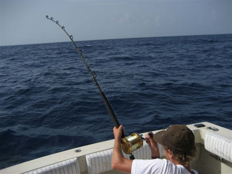 Terwijl de hulp aan boord bezig was met het aas stonden er al 2 hengels uit en ineens keek de hulp op en greep een hengel en sloeg aan…..
