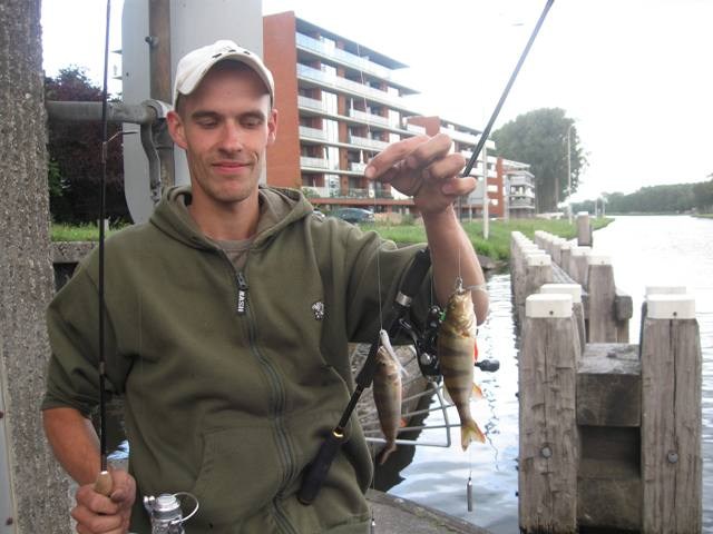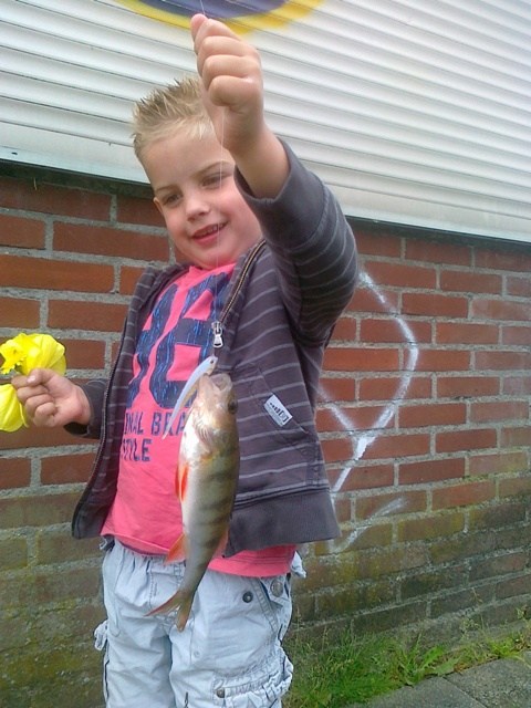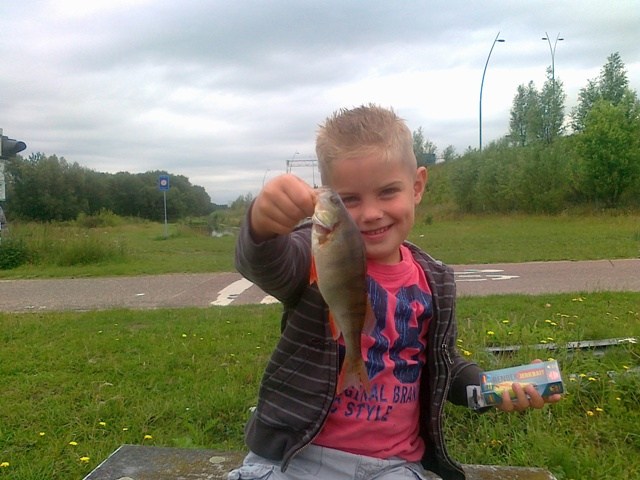 Vanmorgen ben ik effe bij Bas in de shop geweest.Effe bijpraten,assortiment bekijken,kofferbak volladen en dan toch maar weer even naar de waterkant.Na een paar aanbeten,tikt mijn hengel weer Bingo!! Een baarsje is weer op de dropshot geschoven.Mike mijn kleinste telg van 3 zegt:Oh kom maar pap die gooi wel effe terug.Duimpje erin,poseren en terug.Catch en release,je kunt er niet vroeg genoeg mee beginnen.Hij vraagt of hij ook een keer mag draaien aan de molen,tuurlijk Vismaat zeg ik.Ik gooi in,hij draait en daar gaat ie weer.Weer twee baarzen op teller erbij.Nu maar gauw naar huis,zijn broer van school afhalen en vanmiddag toch maar weer naar de waterkant.Als we iets vangen zie je het vanavond wel!Gr Rob en Mike