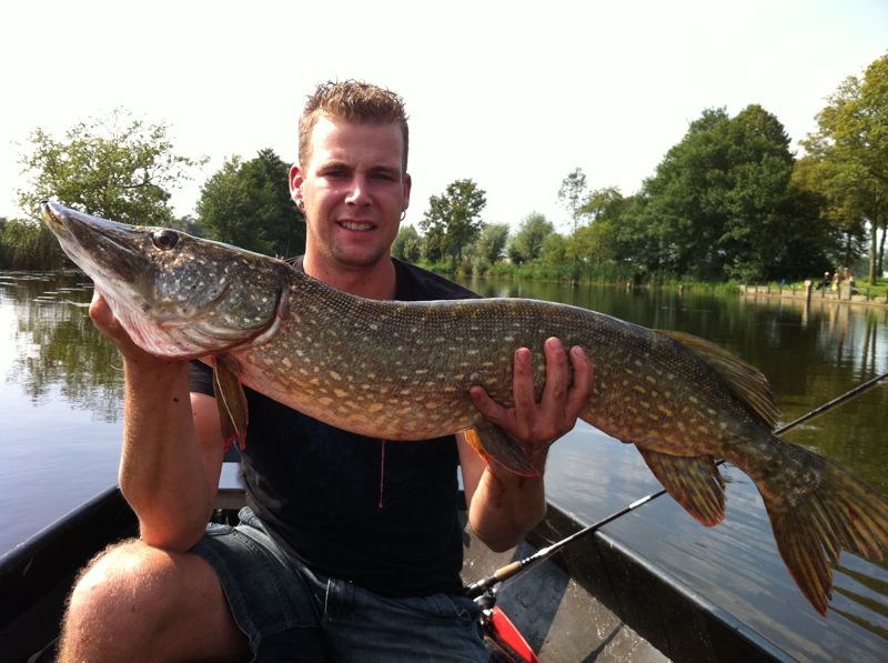 Ik besluit mijn streamer te laten hangen en vaar richting het bredere water,en net bij het punt dat we zeggen dat dit wel eens vis op zou kunnen leveren,krijg ik een dikke beuk en roep meteen SNOEK!!In eerste instantie denken we dat het om een kleine snoek gaat maar na een paar runs veranderen onze gedachten hierover.Na een paar minuten komt de is langs de boot en wil mijn maat hem scheppen.Maar daar is de snoek het niet mee eens en duikt tussen de plompbladeren.En nu....zo vast als ik weet niet wat,ik trek is aan mijn hengel en de spanning valt van de lijn BALEN weg denk ik!!"#$$"$#%%& Maar als ik de lijn strak draai blijkt de snoek er nog aan te zitten.Ik weet haar tussen de planten uit te krijgen en de boot in.95 cm snoek op een streamer!!Gauw een foto en terug met deze temperatuur.Met een dikke staartslag duikt ze weer de diepte in.Vlug een drinkpauze en verder.We trollen verder en de streamer blijft aan de wartel hangen,we blijven niet meer lang dus ik hoop vlug wat te vangen.Maar dat duurt toch een klein uur.ik krijg beet,maar de snoek weet los te komen.Nog een keer erover heen varen en jawel hoor,tien meter voor de plek waar ik hem loste is het wederom raak.Een snoek van 67 cm mag effe op de foto om weer vlug terug te gaan.We houden er voor vandaag mee op,ik heb al hoofdpijn gekregen en met 5 baarzen en 2 snoeken is het mooi geweest.