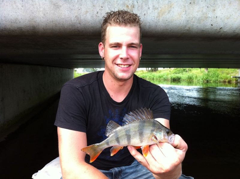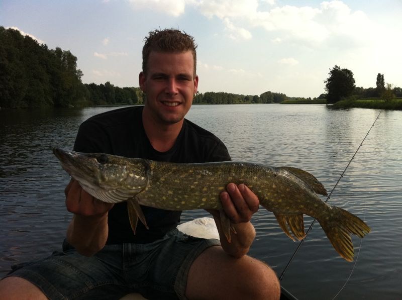 Het beloofd deze zaterdag een zeer warme dag te worden met temperaturen boven de 25 graden.Waar anderen dan zweren dat je niets zult vangen,heb ik daar hele andere gedachten over.Al mijn PR visvangsten zijn op het heetst van de dag gevangen dus wat is wijsheid.Vandaag gaan we voor de derde keer de wetering op met mijn bootje,heb er veel vertrouwen in,daar ik nog iedere keer een snoek van boven de 80 cm heb weten te vangen.We gaan vandaag wel wat later omdat mijn vismaat voor vandaag niet echt een vroege vogel is.Maar goed om half tien liggen dan toch in de zon te dobberen.We varen eerst een heel stuk om bij een goede stek,met dood aas onder de dobber te gaan vissen.Na 3 uur bakken in de zon zonder enige aanbeet besluiten we eerst evende friettent te bezoeken voor een vette hap.Met goed gevulde maag gaan we vol goede moed weer het water op.Ik besluit met streamers en blinkers te gaan gooien,natuurlijk gaat de Mepps streamer eraan die ik bij de fotowedstrijd heb gewonnen.(Bedankt nog Rob en Bas)De eerste worp is meteen bingo,een kleine baars zag er wel wat in.Na een aantal worpen staat de teller op 5 baarzen.Maar de baarzen zijn niet waar we voor gekomen zijn dus trollen we naar het grotere/bredere water.