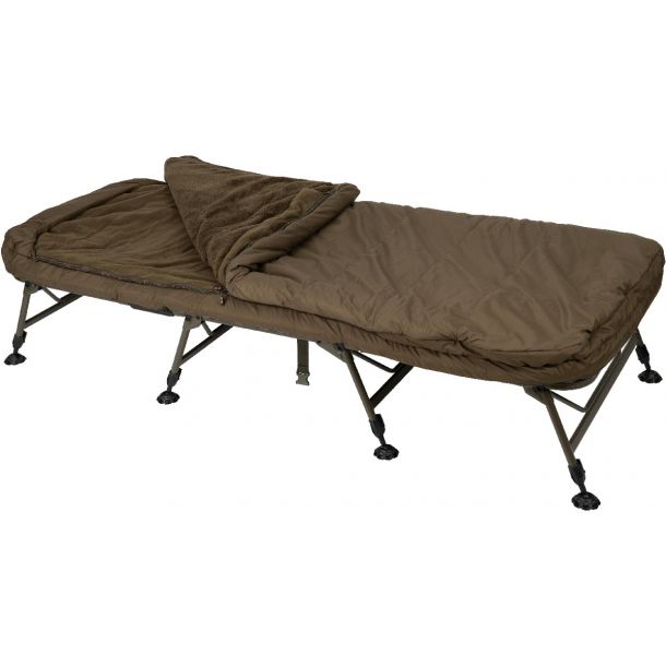 De Fox Flatliner X MF8 All Season System is een vernieuwde, luxueuze uitvoering van de populaire Flatliner-serie. Deze bedchair biedt ultiem comfort en stabiliteit dankzij een stevig frame met vier dubbele poten en een 60mm dik matras van memory foam dat zich perfect vormt naar het lichaam. Het zachte, naadloze fleece matras zorgt voor een comfortabele nachtrust en extra slaapruimte. Het geïntegreerde Ventec All Season systeem bestaat uit een volledig ingeritste slaapzak die geschikt is voor alle seizoenen. De omkeerbare binnenslaapzak biedt keuze tussen een warme sherpa- en microfleecezijde of een ademende polyester voering, zodat je het klimaat naar wens kunt aanpassen. Door de praktische details, zoals in hoogte verstelbare poten, een eenvoudig tension strap systeem en een shrink-wrap kussenhouder, is dit systeem niet alleen comfortabel maar ook zeer gebruiksvriendelijk. De hoogwaardige isolatie met 7 Core Hollow Fibre vulling en royale tochtflappen garanderen uitstekende warmtebehoud, zelfs bij koud weer. Met een lengte van 225 cm, een breedte van 97 cm en een verstelbare hoogte van 43 tot 55 cm biedt de Flatliner X MF8 All Season System maximale ruimte en ondersteuning. Met een gewicht van 26,2 kg combineert dit systeem luxe, stevigheid en functionaliteit in één compleet slaapsysteem – ideaal voor de veeleisende karpervisser die het hele jaar door comfort en betrouwbaarheid verwacht.