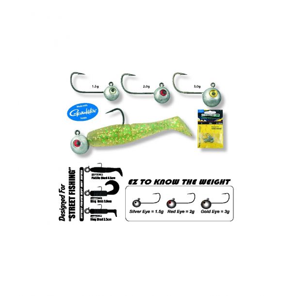 Een Gamakatsu Jig29 haak met een speciaal gevormde kop voor een speciale actie. De kleine kopjes nemen niet weg dat er geen grote vissen mee gevangen kunnen worden; de haken zijn er sterk genoeg voor! NB: het gewicht van de kleine jigs is herkenbaar aan de kleur van de ogen; 1,5gr = zilver / 2gr = rood / 3gr = goud.