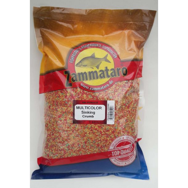 De Zammataro Multicolor Sinking Crumb zijn gearomatiseerde deeltjes die ervoor gaan zorgen dat de vangsten worden vergroot. De Multicolor Sinking Crumb van Zammataro is zonder meer een van de toppers uit het assortiment van Zammataro. Ben jij een moderne witvisser die succes nastreeft in je visserij? Dan mag deze kleurrijke mix van gearomatiseerde deeltjes absoluut niet in het voerassortiment ontbreken. De Zammataro Multi Color Sinking Crumb heeft een romige en zoete chocoladesmaak. Het kleurrijke mengsel van de Sinking Crumbs wekken zonder meer nieuwsgierigheid op bij de vissen en tegelijkertijd zal het de vissen langer op de stek houden zonder te verzadigen. Zelfs de meest schuwe vissoorten zoals karper en brasem komen in de verleiding om te bijten. De Multicolor sinking crumbs lossen langzaam op en geven de vissen de indruk dat ze azen naar muggen en kleine larven.