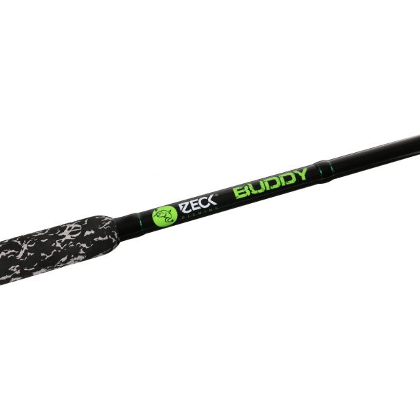 Bij de Zeck Buddy was het niet eenvoudig om een hengel te ontwerpen die dezelfde kwaliteitsnorm heeft als alle andere Zeck meerval hengels en tegelijkertijd goedkoper moet zijn. Zeck wilde niet op de componenten besparen. Daarom zijn de Sea-Guide-ringen, de Fuji-reelhouder en cone, evenals handvat, wikkelingen, lak etc. precies hetzelfde als bij de Zeck Pro-Cat serie .Maar waar kan Zeck nu op besparen bij deze hengel om de prijs laag te houden? Het idee wat Zeck uiteindelijk kon implementeren was het ontwikkelen van een moderne blank uit glasvezel. Omdat deze grondstof aanzienlijk goedkoper is dan koolstofvezel kon Zeck de Buddy voor een prijs in de handel brengen die ook interessant is voor beginners, jongeren of vissers die rond de 100 euro willen uitgeven voor een meerval hengel. Na een lange testfase is het ons duidelijk: als je geen afstandhengel zoekt om af te spannen is de Buddy een perfecte oplossing als betaalbare hengel. De actie met 300 gram werpgewicht is vergelijkbaar als de Zeck Short en Soft hengel maar door zijn glasvezel blank is deze hengel een stuk parabolischer met iets minder body. Zelfs grote vissen kunnen eenvoudig worden gedrild, terwijl kleinere exemplaren voor veel drilplezier zorgen. De Buddy 320 weegt slechts 40 gram meer dan onze Pro-Cat van 3,00 meter en benadrukt verder dat de blank geen gelijkenis kent met de oudere generaties glasvezel blanks. De Zeck Pro-Cat is afgebouwd met een Fuji DPS H/24 molenhouder en 10+1 Seaguide geleideogen met een startoog wat een diameter van 30mm heeft. De hengel is even gedeeld en heeft een transportlengte van 165cm. De achterkant van het handvat heeft een lengte van 45cm. De hengel is perfect allround toe te passen vooral bij de visserij met het afspannen van de meerval montages, dobber vissen, boeien vissen en het vissen met grondmontages op afstanden tot 200 meter.